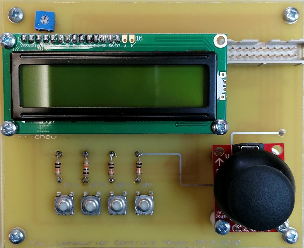 Voici la carte afficheur LCD. Elle comporte l’un des trois afficheur de notre projet. Grâce à elle, on peut afficher les données de manière textuelle. Ainsi en utilisant le joystick et les boutons, l’utilisateur sera en mesure de naviguer à travers les menus lui permettant d’afficher les données de plusieurs manières différentes.